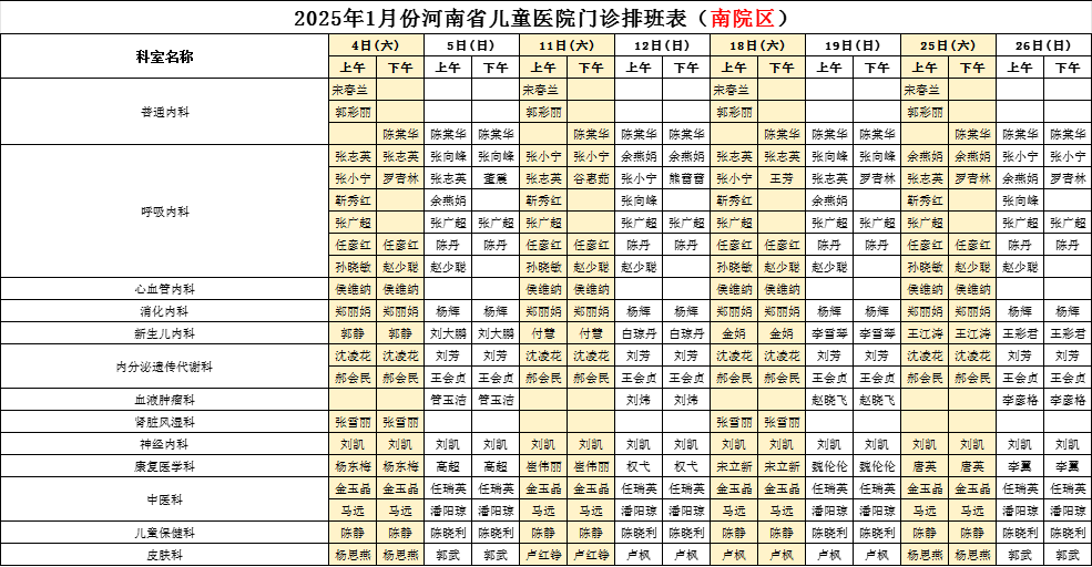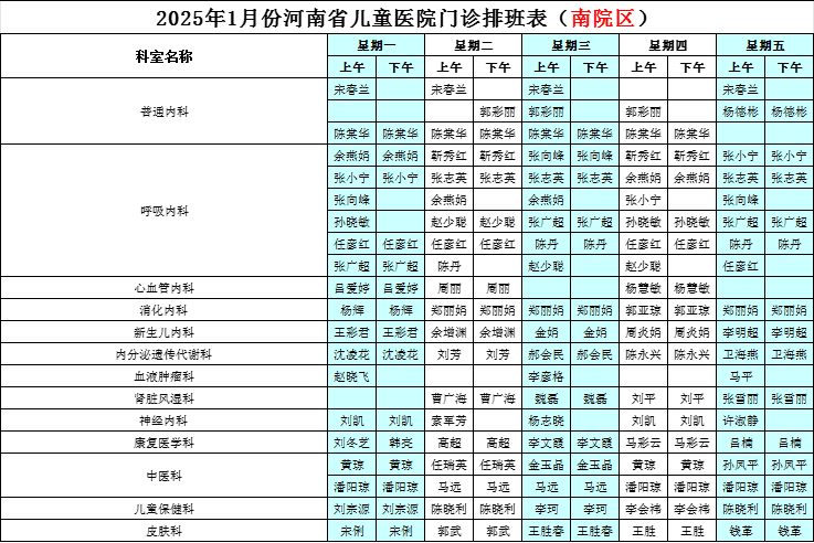 2025年1月份河南省兒童醫(yī)院南院區(qū)專家坐診表(含周末)