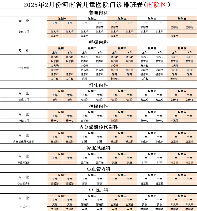 2025年2月份河南省兒童醫(yī)院南院區(qū)專家坐診表