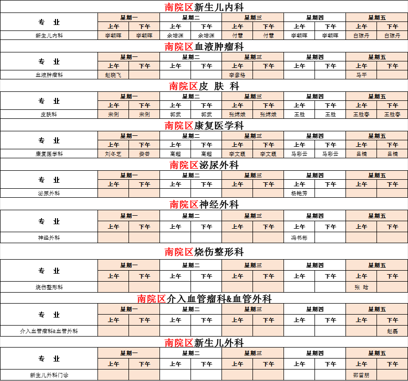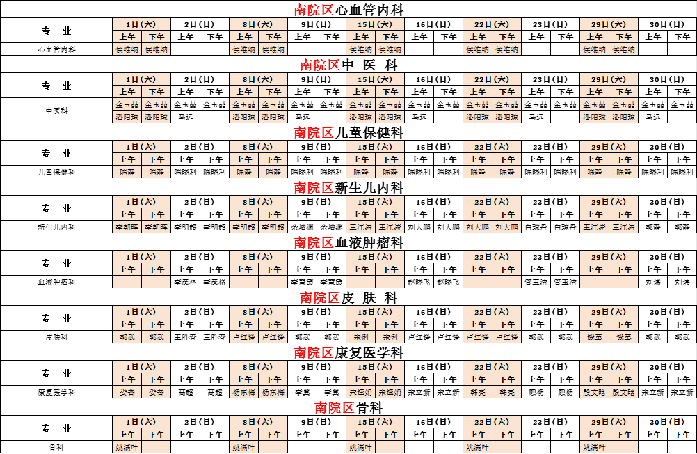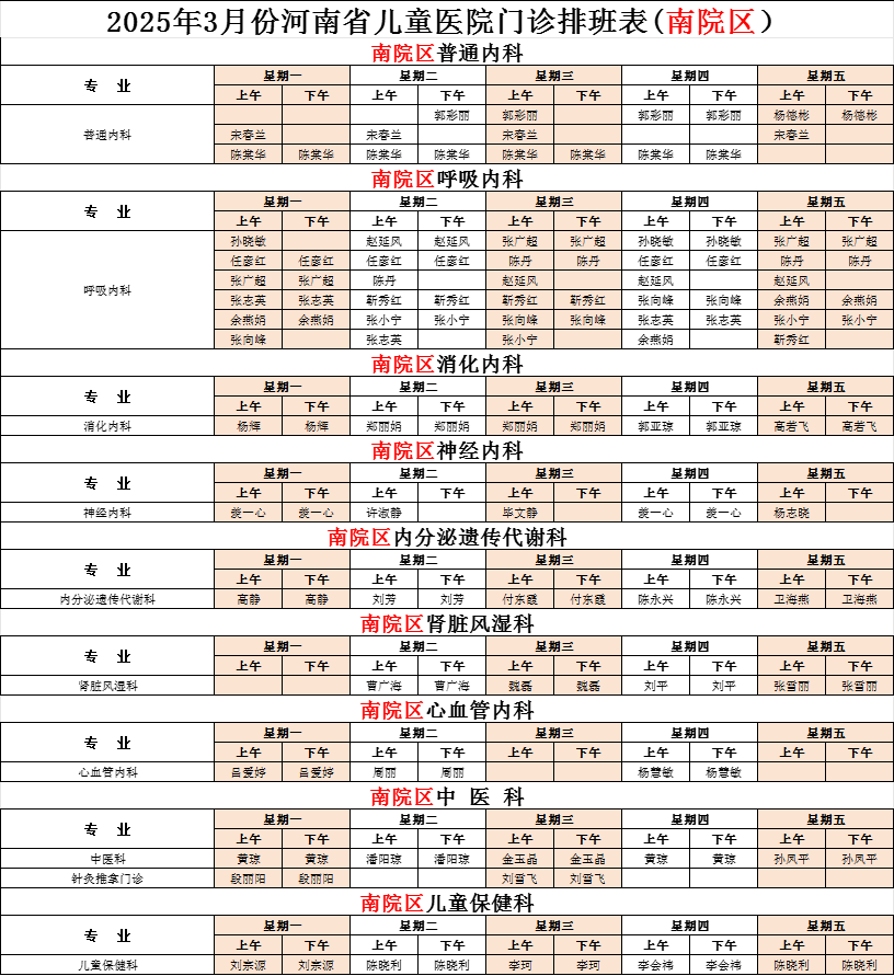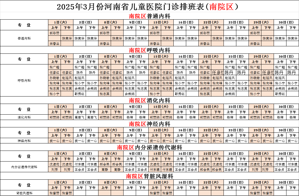 2025年3月份河南省兒童醫(yī)院南院區(qū)專家坐診表(含周末)