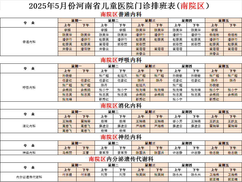 2025年5月份河南省兒童醫(yī)院南院區(qū)專家坐診表