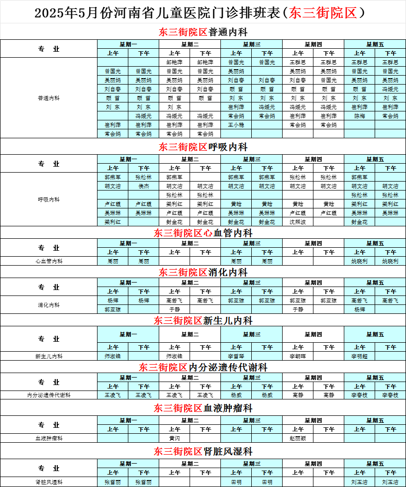 2025年5月份河南省兒童醫(yī)院東三街院區(qū)專家坐診表