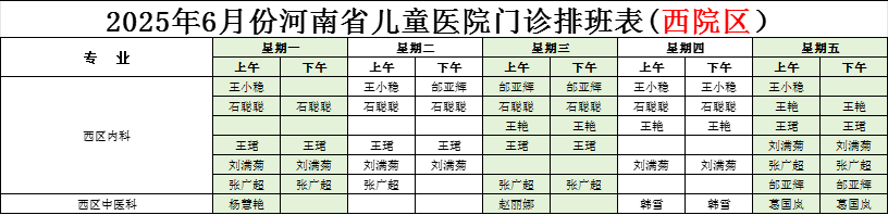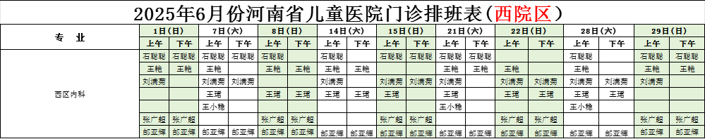 2025年6月份河南省兒童醫(yī)院西院區(qū)專家坐診表(含周末)
