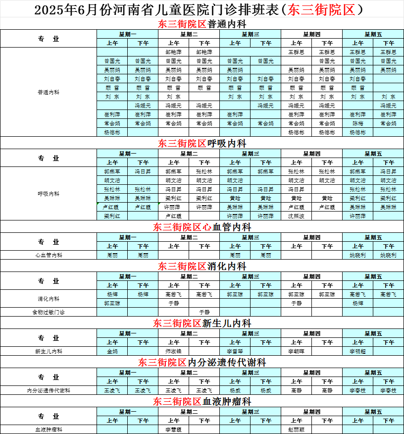 2025年6月份河南省兒童醫(yī)院東三街院區(qū)專家坐診表