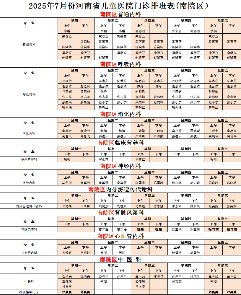 2025年7月份河南省兒童醫(yī)院南院區(qū)專家坐診表