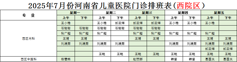 2025年7月份河南省兒童醫(yī)院西院區(qū)專家坐診表(含周末)