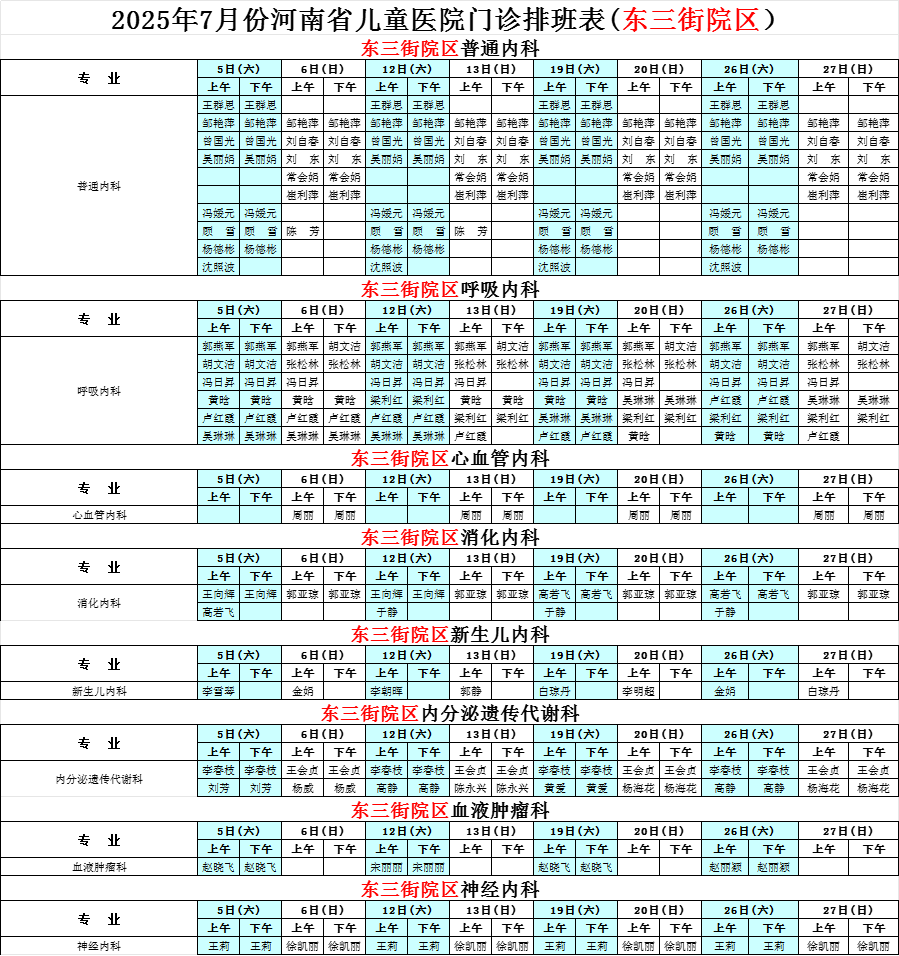 2025年7月份河南省兒童醫(yī)院東三街院區(qū)專(zhuān)家坐診表(周末)