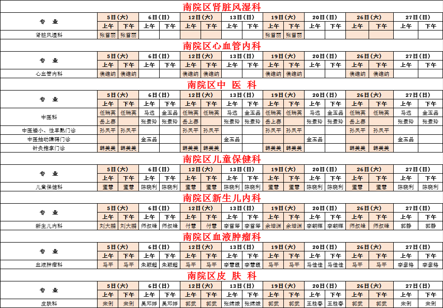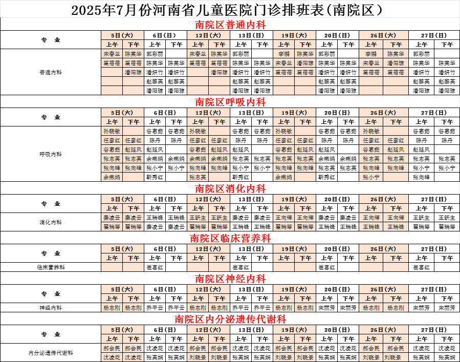2025年7月份河南省兒童醫(yī)院南院區(qū)專家坐診表(周末)