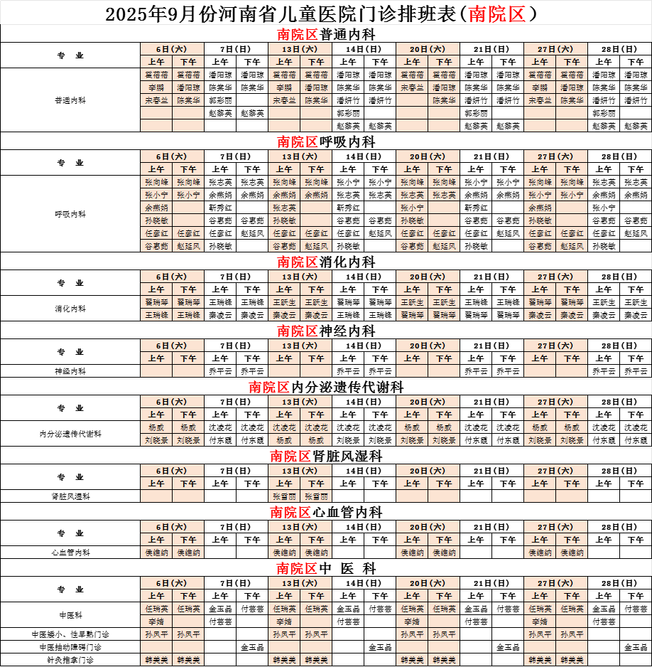 2025年9月份河南省兒童醫(yī)院周末專家坐診表(南院區(qū))
