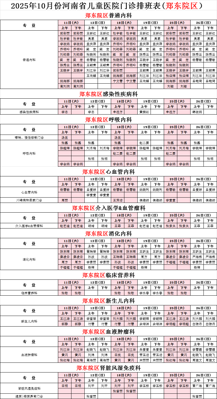 河南省兒童醫(yī)院鄭東院區(qū)2025年10月專家坐診表(周末)