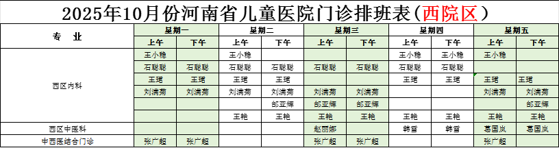 河南省兒童醫(yī)院西院區(qū)2025年10月專家坐診表(含周末)