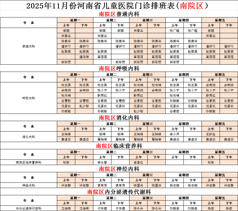 河南省兒童醫(yī)院南院區(qū)2025年11月專家坐診表