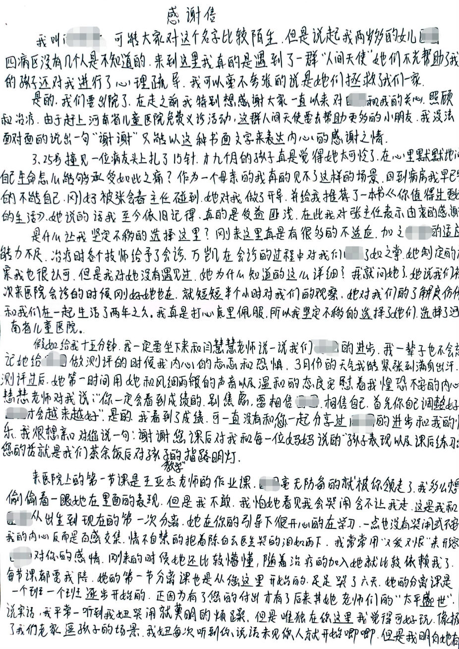 “這是園園之前從來(lái)沒(méi)有過(guò)的,睡覺(jué)也好了很多”家長(zhǎng)開(kāi)心地說(shuō),住院期間孩子的進(jìn)步經(jīng)常讓媽媽喜極而泣,出院前一家人特意送來(lái)感謝信。